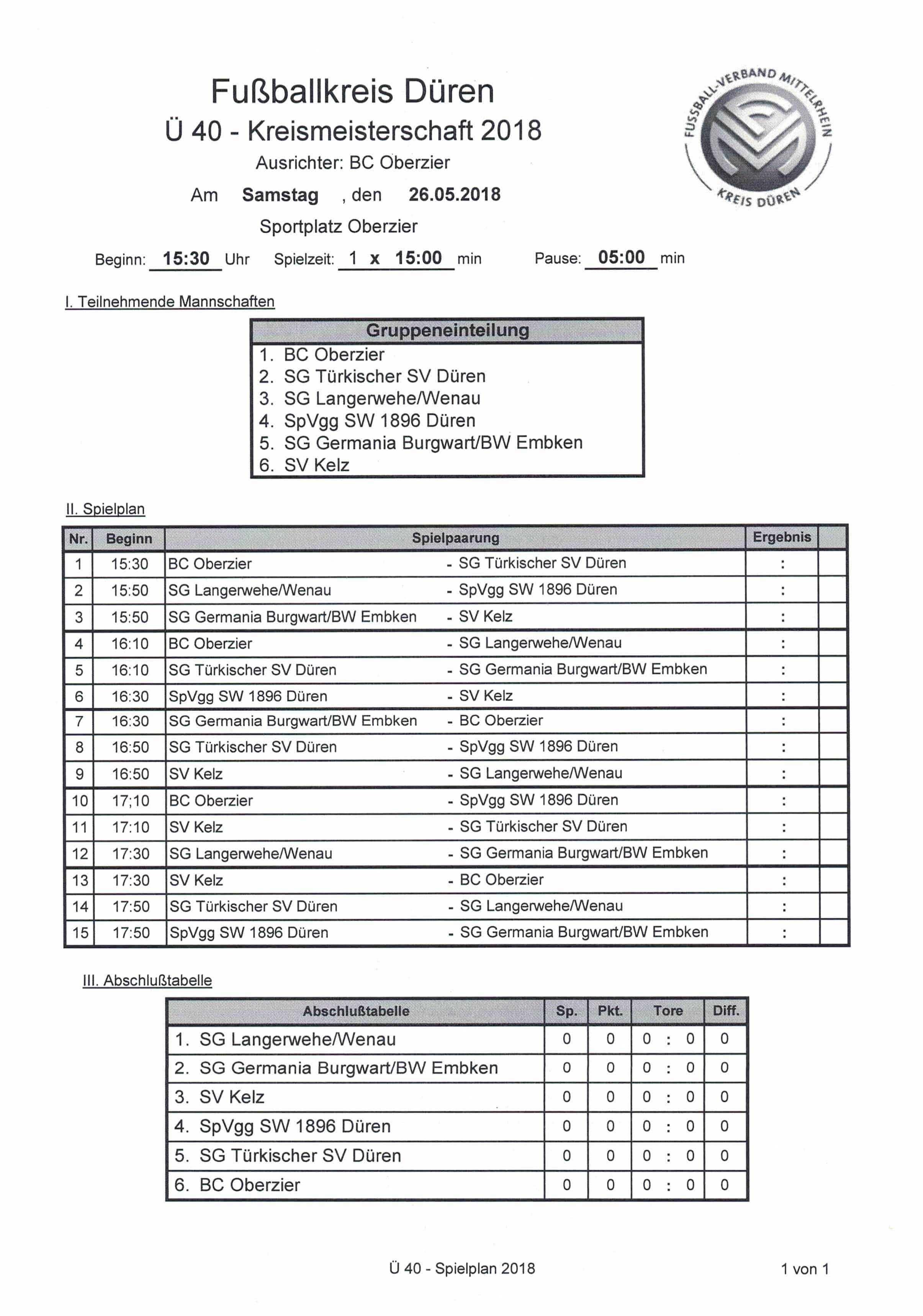 Neben dem gastgebenden BC Oberzier werden die Teams der SG Türkischer SV Düren, SG Langerwehe/Wenau, Schwarz Weiss Düren, SG Germania Burgwart/BW Embken und SV Kelz teilnehmen.