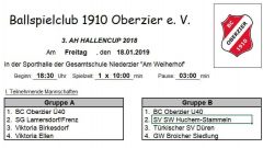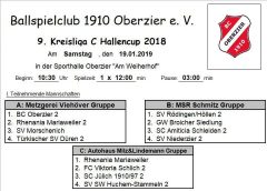Weiter geht es dann am Samstag, den 19.01.2019 ab 10.30 Uhr mit dem Kreisliga C-Hallencup 2019. Hier erwarten wir insgesamt 12 Mannschaften, die in3 Gruppen mit je 4 Mannschaften die Viertelfinalspiele ermitteln, diese beginnen ab 15.00 Uhr die Halbfinalspiele sind ab 16.00 Uhr vorgesehen.