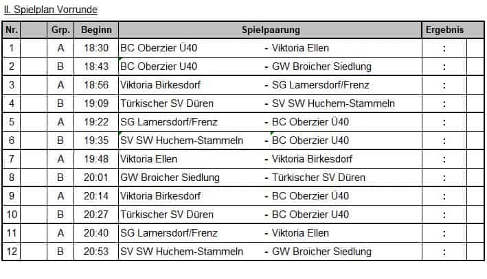 Gestartet wird am Freitag, den 18.01.2019 um 18.30 Uhr mit dem AH-Hallencup mit insgesamt 8 teilnehmenden Mannschaften: BCO 1, BCO2, Viktoria Ellen, SV SW Huchem-Stammeln, SG Lamersdorf/Frenz, GW Broicher Siedlung, Türkischer SV Düren und Viktoria Birkesdorf. Die Endspiele beginnen ab 21.15 Uhr.