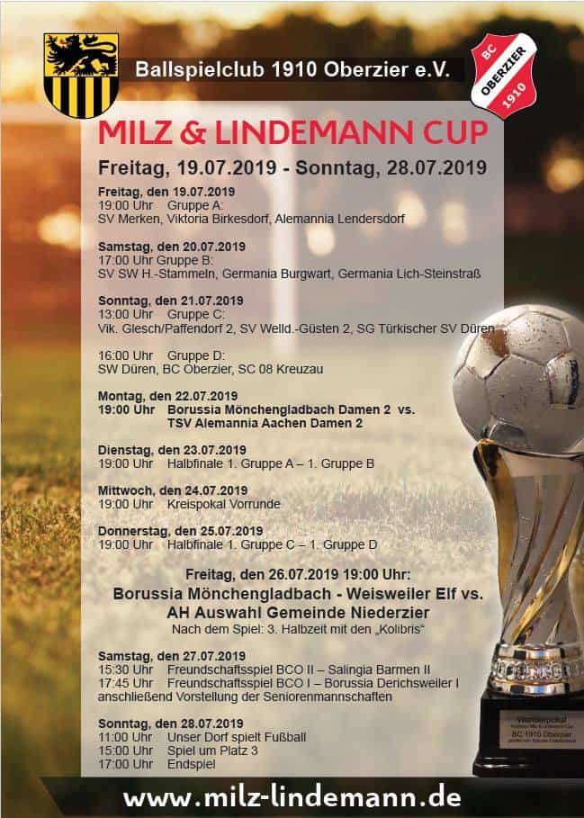 Wiederum ist es den Verantwortlichen des BCO gelungen, ein interessantes Teilnehmerfeld zum Autohaus Milz & Lindemann Sommercup 2019 in Oberzier zu präsentieren. Insgesamt 12 Mannschaften werden den Turniersieg ausspielen und die Zuschauer dürfen sich schon heute auf spannende Spiel freuen. Beginn ist am Freitag, den 19.07.2019 – die Endspiele werden am Sonntag, den 28.07.2019 angepfiffen. Titelfavorit ist sicherlich Landesligaaufsteiger SW Düren, aber auch der Türkische SV Düren und Germania Lich-Steinstraß wollen sicherlich als Sieger das Turnier beenden. Weiterhin sind die A-Ligisten: SV SW Huchem-Stammeln, Viktoria Birkesdorf, Alemannia Lendersdorf, Germania Burgwart, Viktoria Glesch-Paffendorf 2 und der Gastgeber BC Oberzier am Start. Abgerundet wird das Teilnehmerfeld vom ambitionierten SV Merken sowie dem SC Kreuzau und GW Welldorf/Güsten 2.Gespielt wird in 4 Gruppen mit jeweils 3 Mannschaften. Die Gruppensieger erreichen das Halbfinale, dass jeweils am Dienstag, den 23.07.2019 und Donnerstag, den 25.07.2019 um 19.00 Uhr angepfiffen wird.